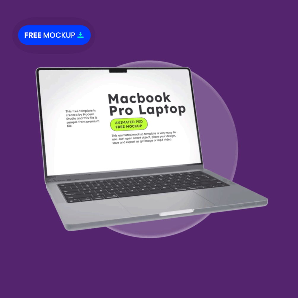 Experience the limitless possibilities of the Free Animated Macbook Pro Mockup. This exceptional template showcases your designs with stunning 3D-rendered visuals and smooth animations, all without any cost. No After Effects needed – simply utilize this mockup in Photoshop for seamless customization. Boost your presentations and captivate your audience effortlessly with this versatile and cost-free mockup solution. Download now and unleash the full potential of your designs, absolutely free! This Mockup is presented by Modern Studio & ModernPSD